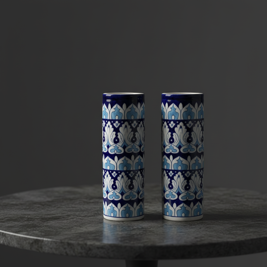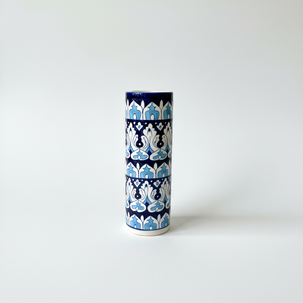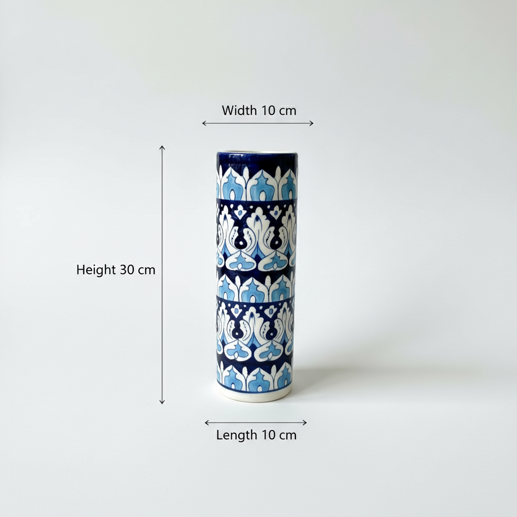 Artisan Note: This pillar vase is hand-thrown on a traditional potter's wheel. Because it is a 100% handcrafted product, minor variations in height and the hand-painted sapphire patterns are expected, celebrating the unique human touch behind every piece.