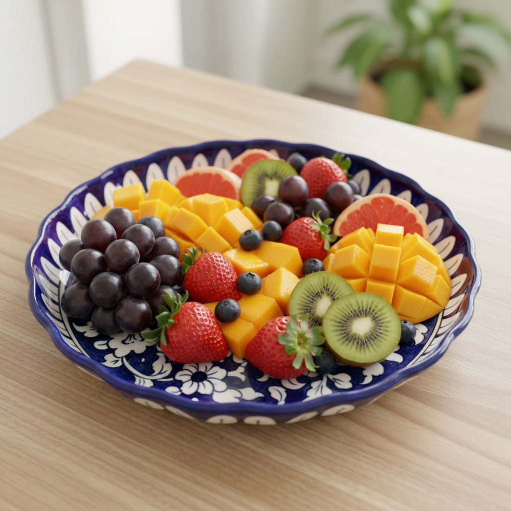 High-End Vitrified Finish: Fired in traditional kilns, the platter is finished with a luxury, high-gloss glaze. This protective layer is food-safe and incredibly durable, ensuring that the sapphire-blue artistry remains as radiant as the day it was painted, even with regular use.